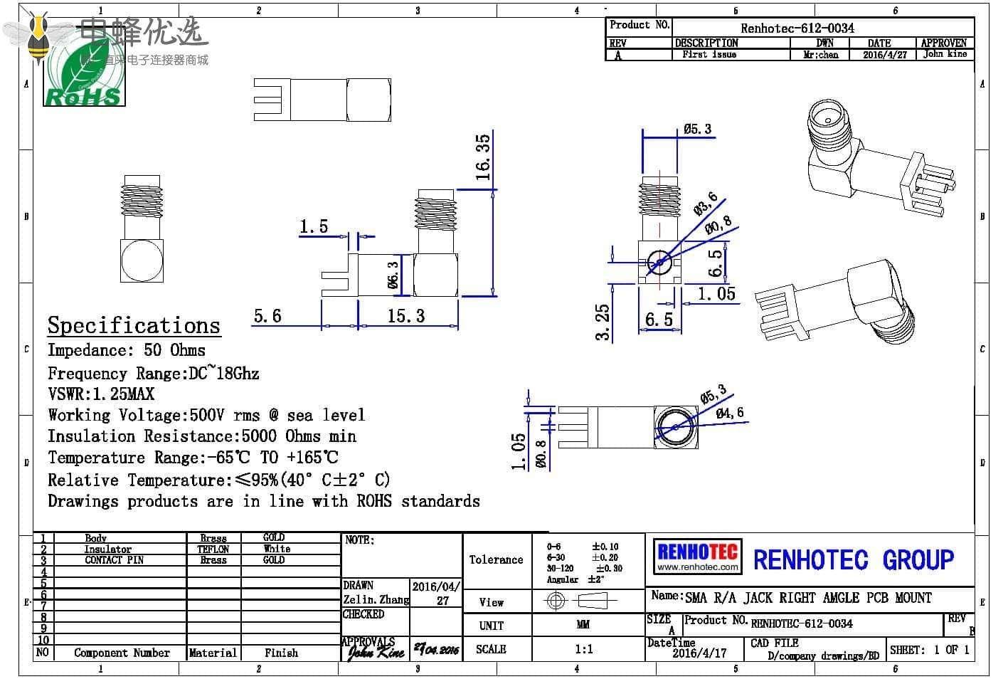 接RG142,RG405线缆时为170 V rms - 中心接触电阻:≦ 6.0mΩ (Milliohms max.)