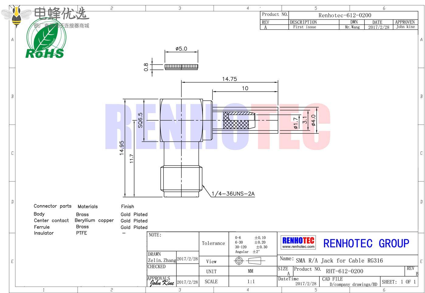 接RG142,RG405线缆时为170 V rms - 中心接触电阻:≦ 6.0mΩ (Milliohms max.)