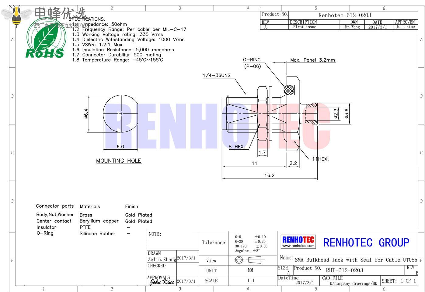 接RG142,RG405线缆时为170 V rms - 中心接触电阻:≦ 6.0mΩ (Milliohms max.)