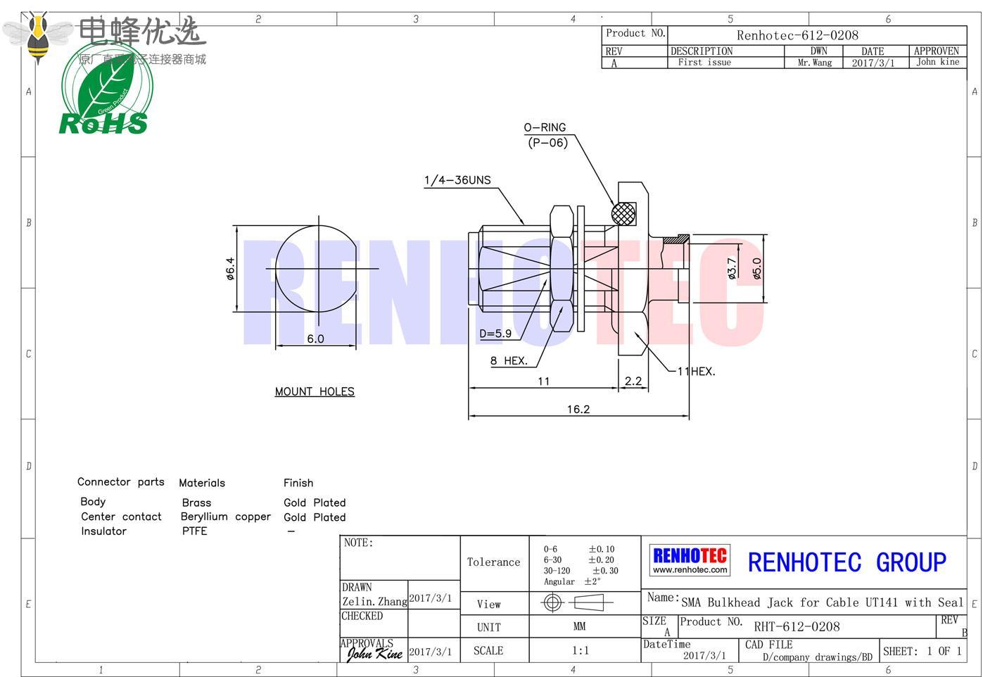- sma连接器,穿墙,焊接,直式,母头,同轴线缆,UT141,防水;