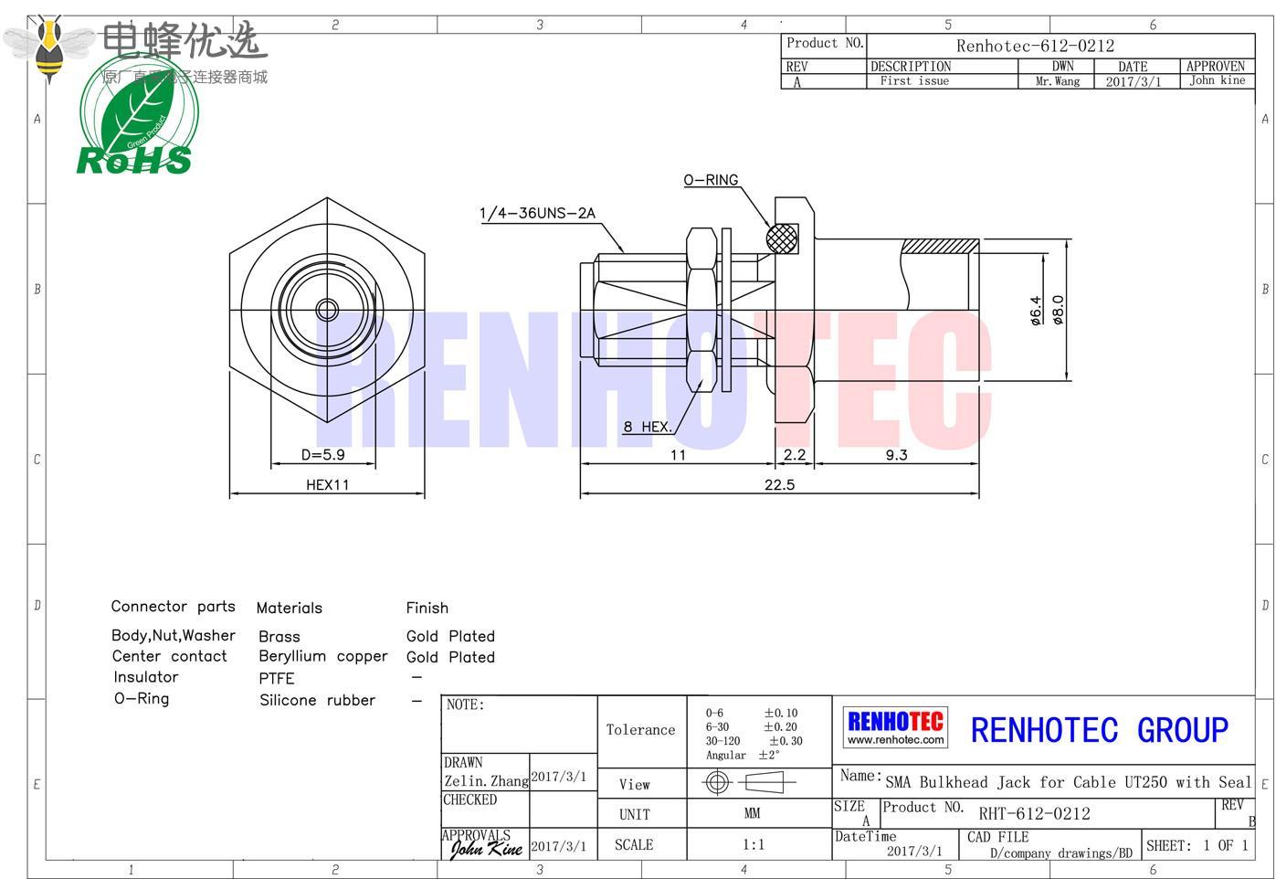 接RG142,RG405线缆时为170 V rms - 中心接触电阻:≦ 6.0mΩ (Milliohms max.)
