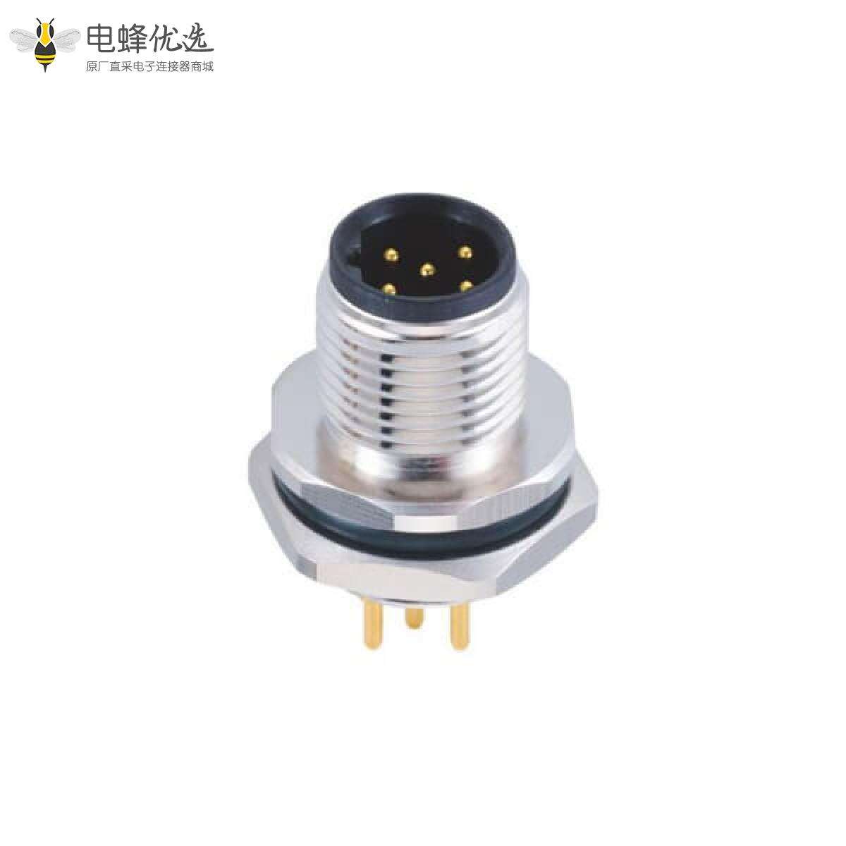 M12,板端插座,B Code,5芯,直式,公头,接PCB板,后锁板;