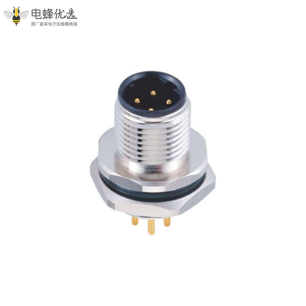 M12,板端插座,D Code,4芯,直式,公头,接PCB板,后锁板;