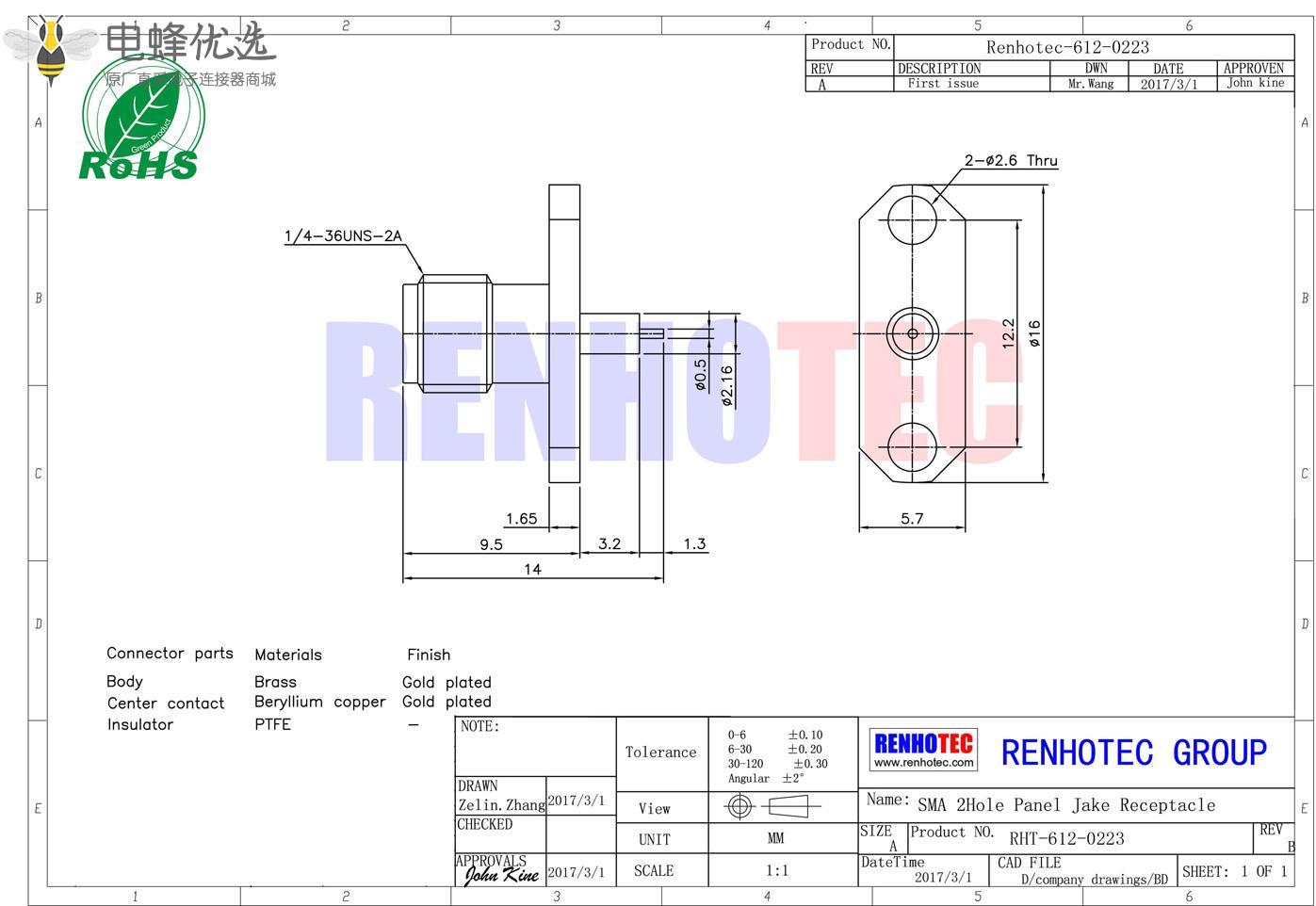 接RG142,RG405线缆时为170 V rms - 中心接触电阻:≦ 6.0mΩ (Milliohms max.)