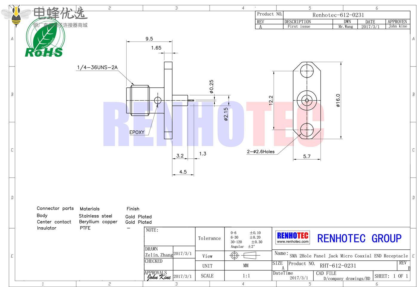 - sma连接器, 面板安装,直式,母头,2孔法兰,延长铁氟龙,树脂灌胶;