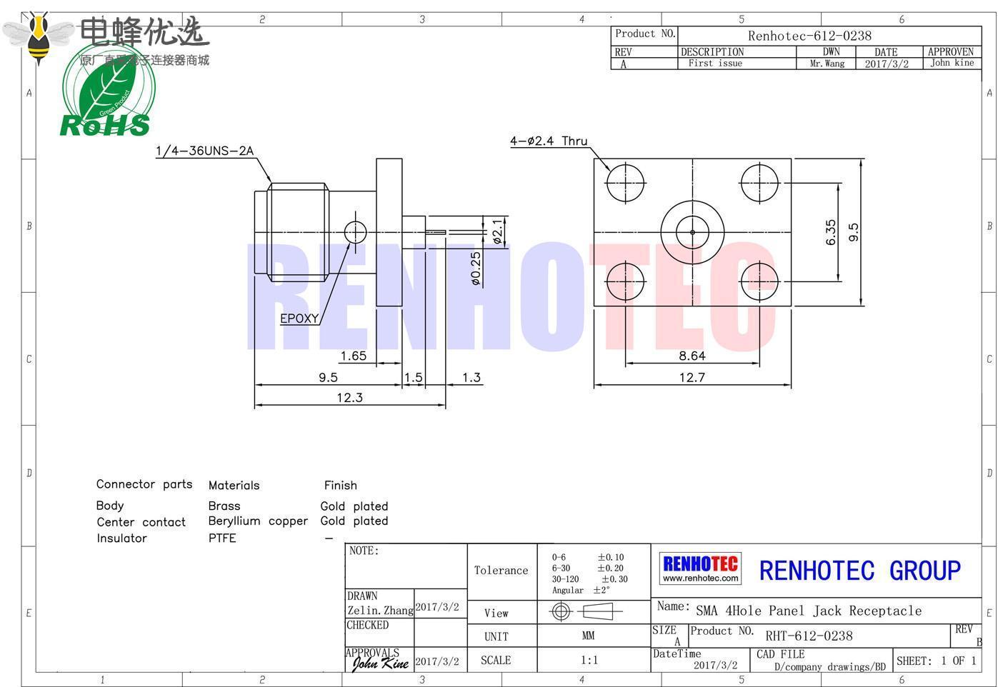 - sma连接器, 面板安装,直式,母头,4孔法兰, 树脂灌胶;