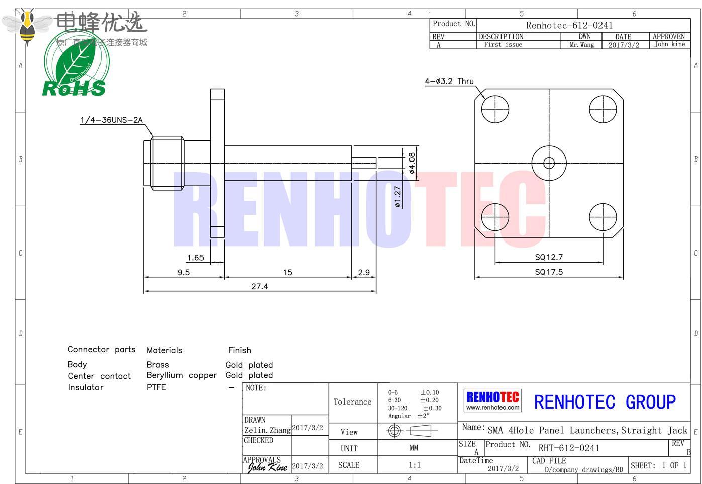 - sma连接器, 面板安装,直式,母头,4孔法兰, 延长铁氟龙,树脂灌胶;