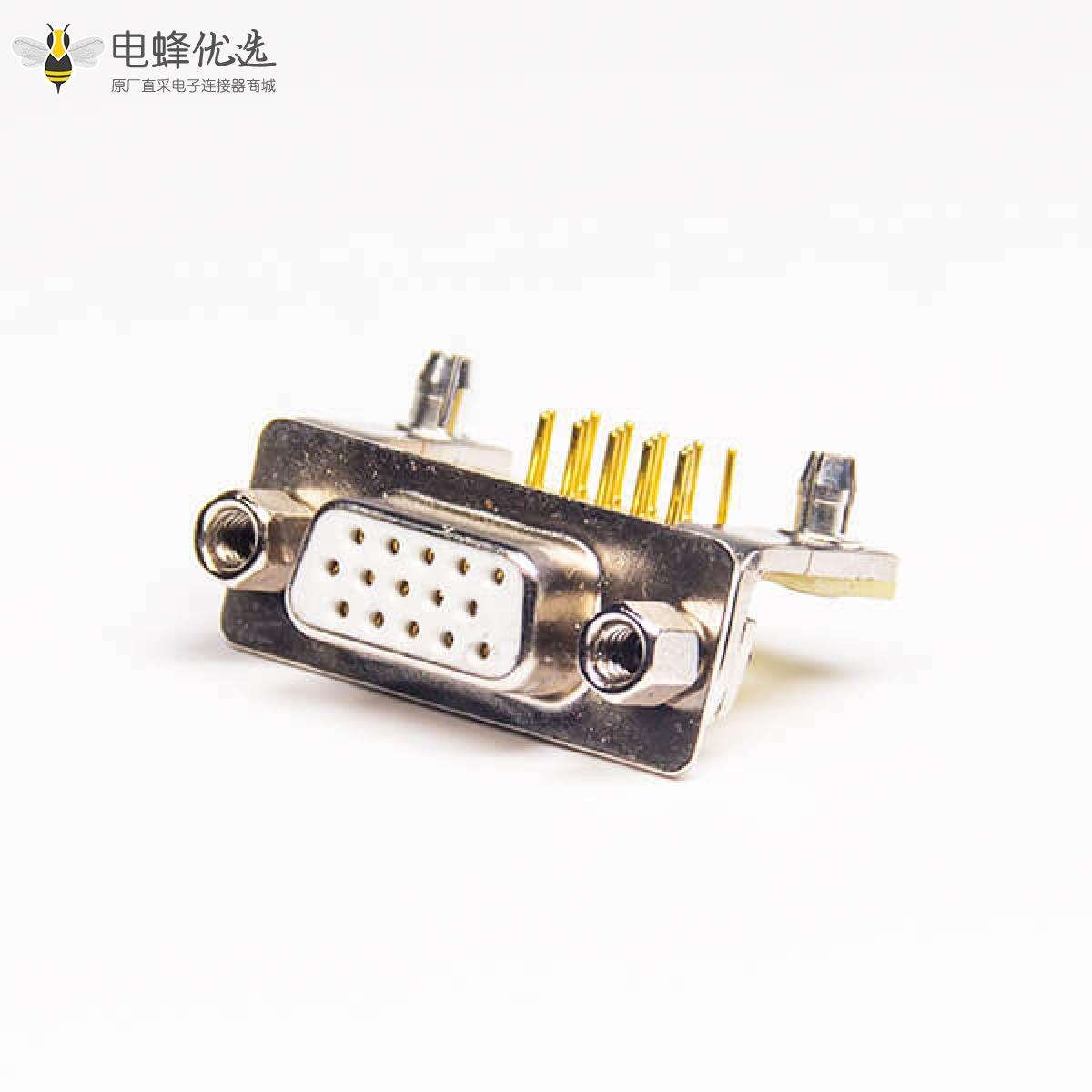 - D-sub连接器,高密度,母头,弯式,90度,车针,镀金,15 Pin,PCB板,穿孔式,白色胶芯,铆锁连接;
