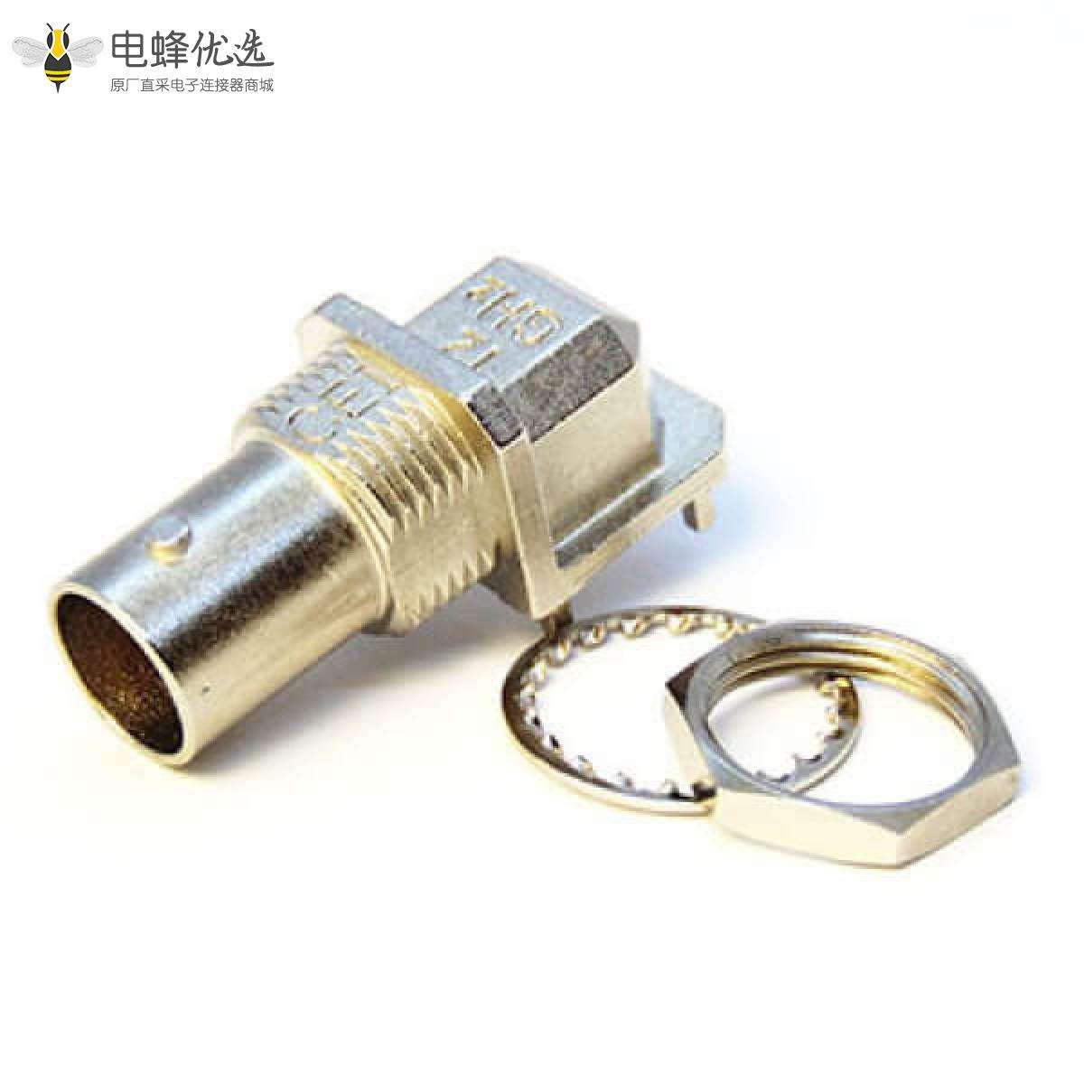 - BNC连接器, 母头, 弯式, 面板安装, 穿墙式, 75欧姆, 镀镍;