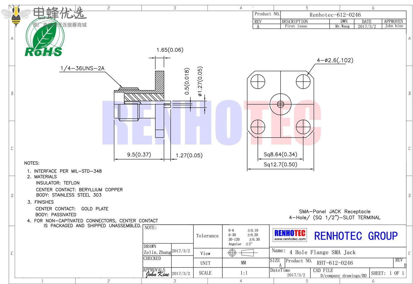 接RG142,RG405线缆时为170 V rms - 中心接触电阻:≦ 6.0mΩ (Milliohms max.)