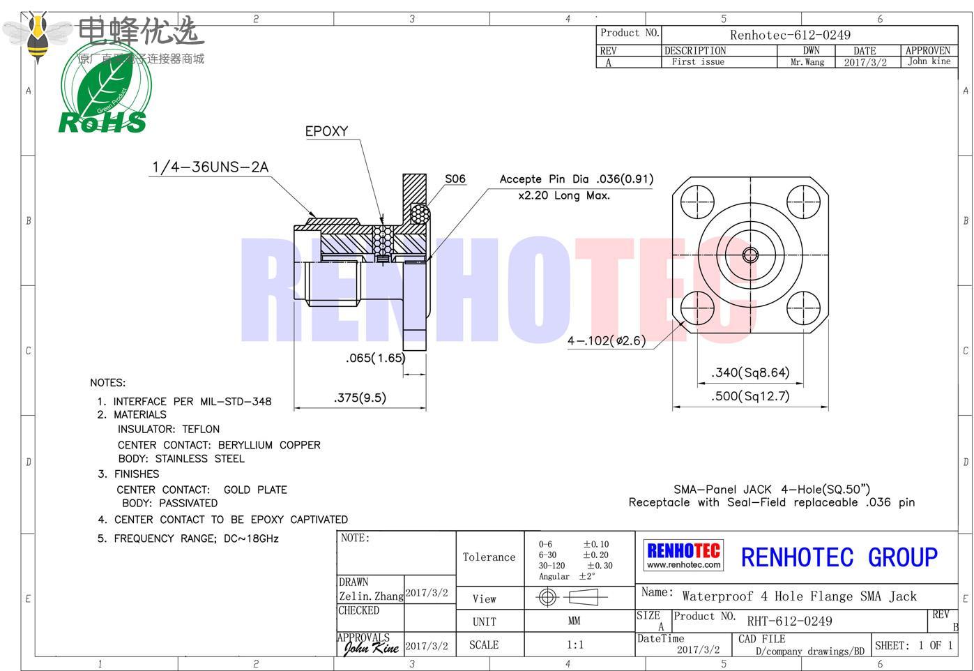 - sma连接器, 面板安装,直式, 母头,4孔法兰, 树脂灌胶, 防水;