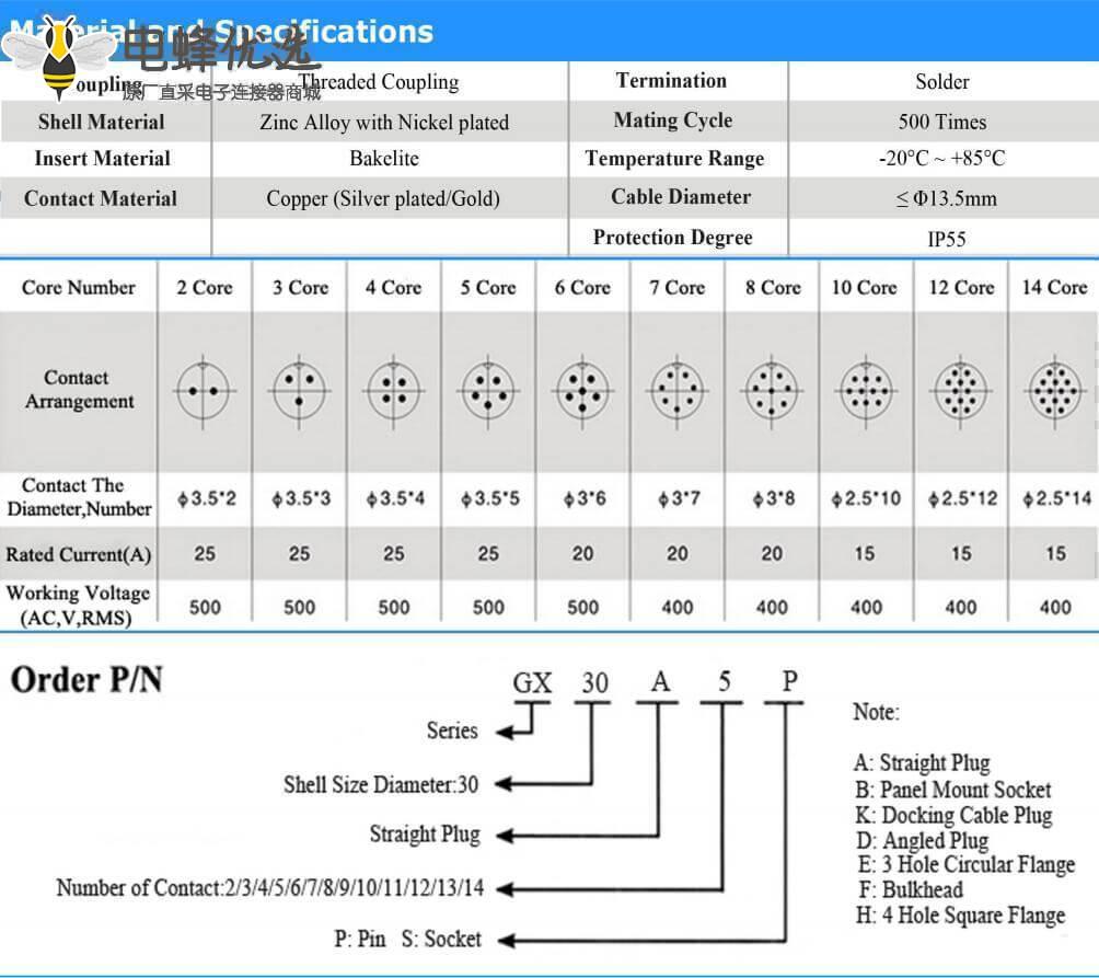 - GX30,常规款,插头/插座,大圆盘安装,12芯,公/母,直式,面板/接线;