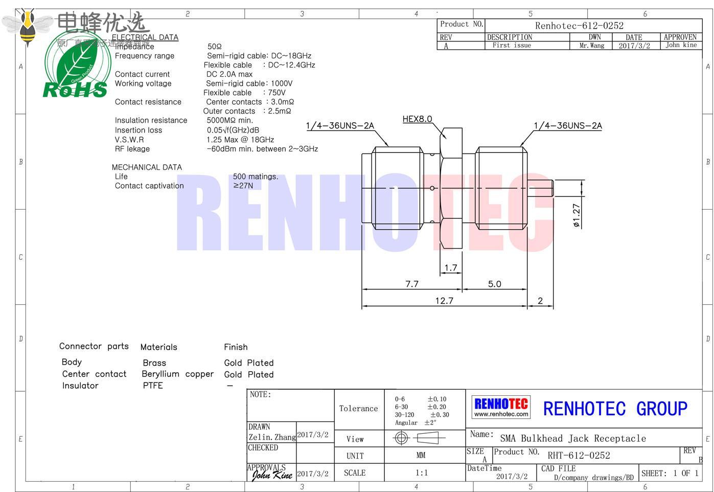 接RG142,RG405线缆时为170 V rms - 中心接触电阻:≦ 6.0mΩ (Milliohms max.)