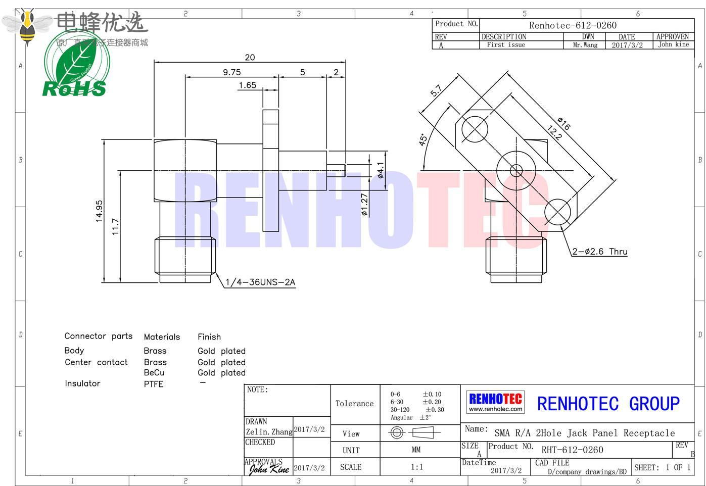- sma连接器, 面板安装,弯式,母头, 2孔法兰, 延长铁氟龙;