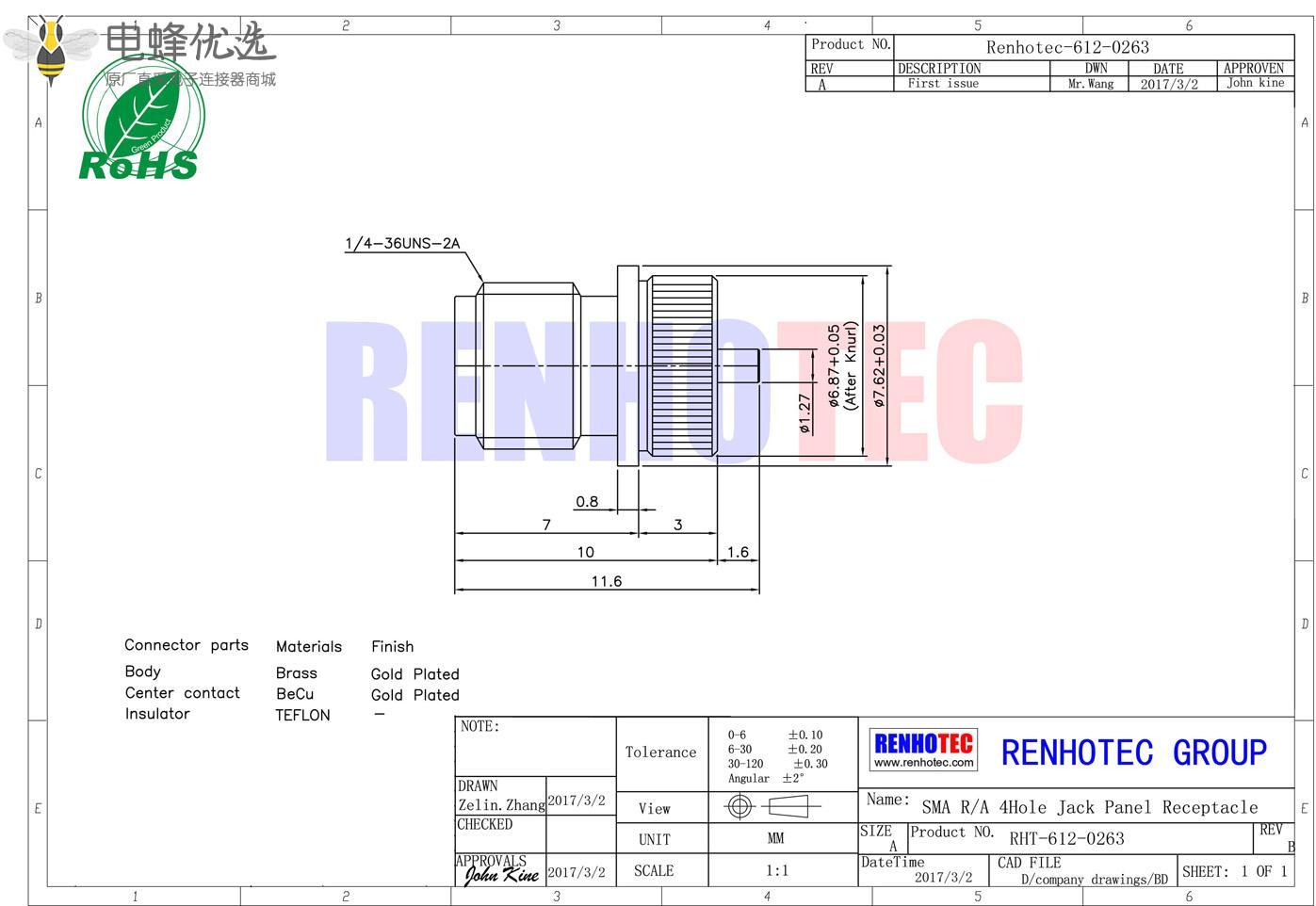 接RG142,RG405线缆时为170 V rms - 中心接触电阻:≦ 6.0mΩ (Milliohms max.)
