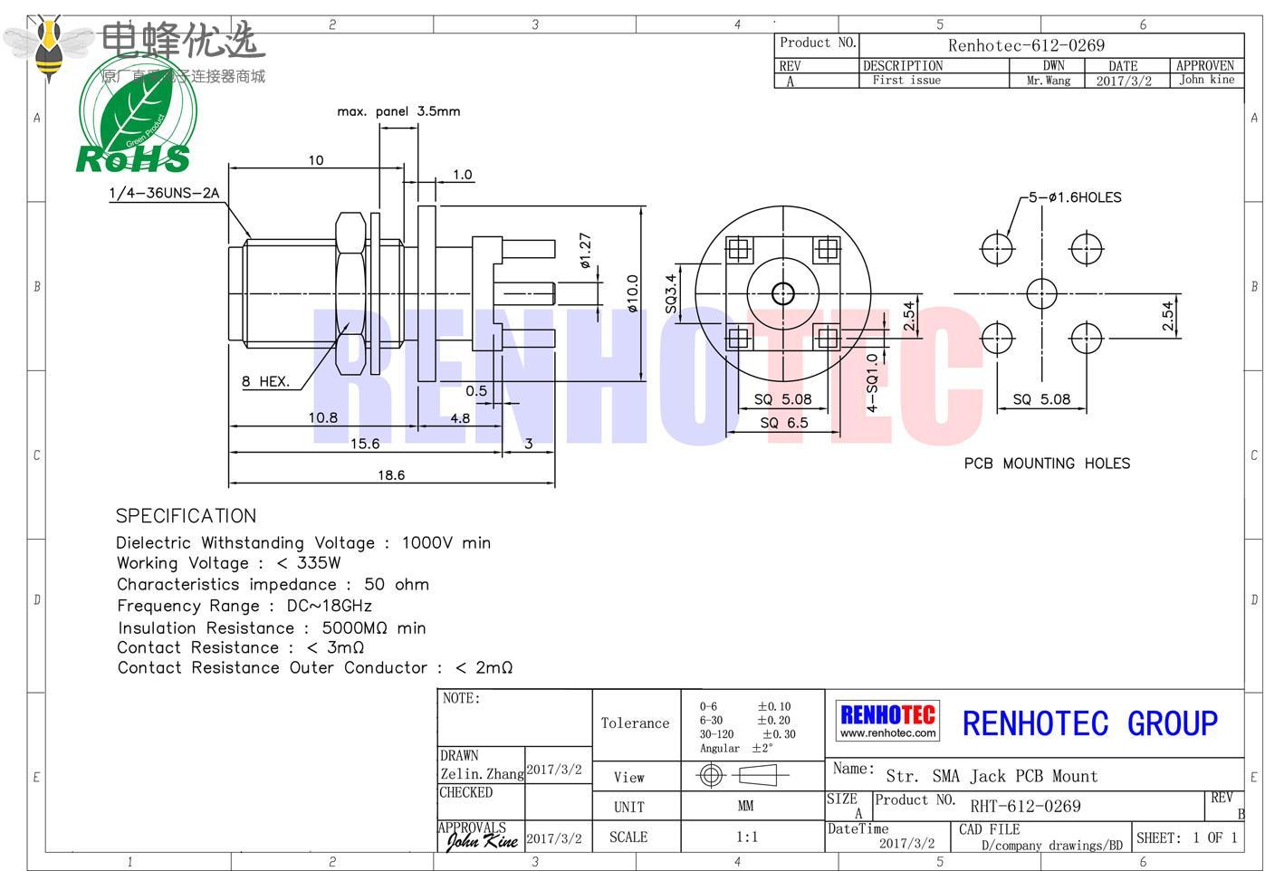 接RG142,RG405线缆时为170 V rms - 中心接触电阻:≦ 6.0mΩ (Milliohms max.)