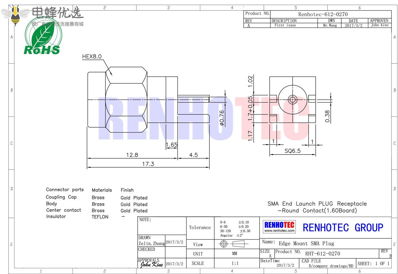 接RG142,RG405线缆时为170 V rms - 中心接触电阻:≦ 6.0mΩ (Milliohms max.)