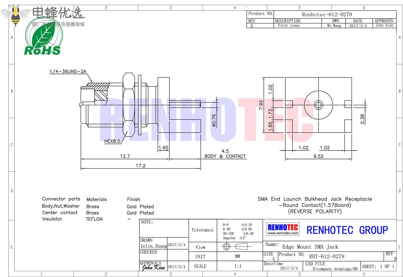接RG142,RG405线缆时为170 V rms - 中心接触电阻:≦ 6.0mΩ (Milliohms max.)