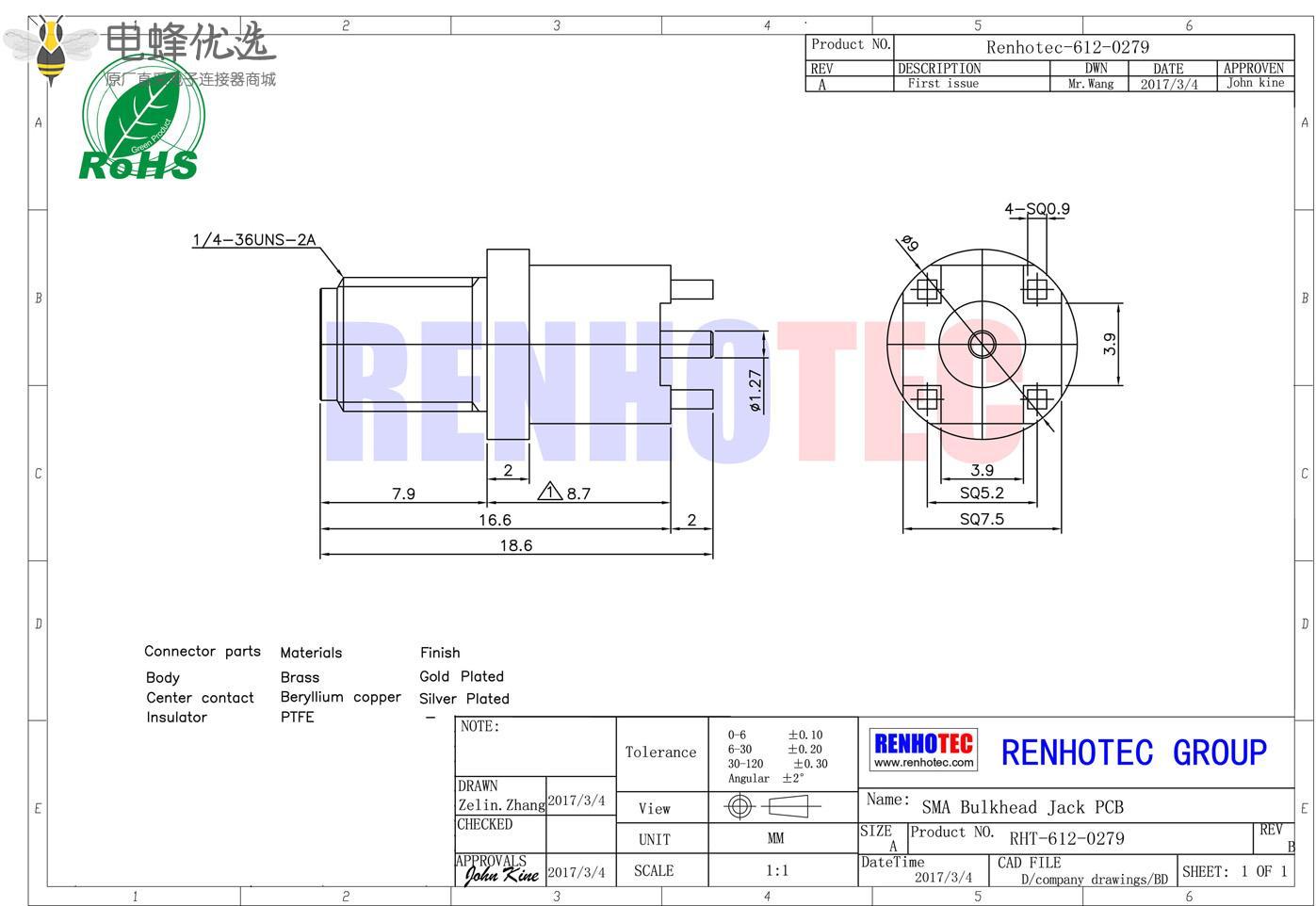 接RG142,RG405线缆时为170 V rms - 中心接触电阻:≦ 6.0mΩ (Milliohms max.)