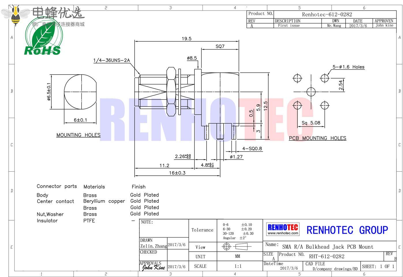 接RG142,RG405线缆时为170 V rms - 中心接触电阻:≦ 6.0mΩ (Milliohms max.)
