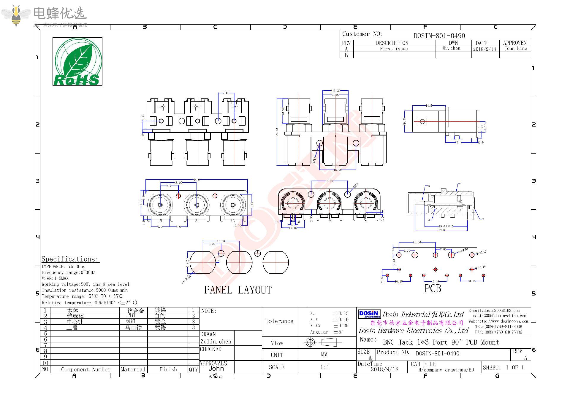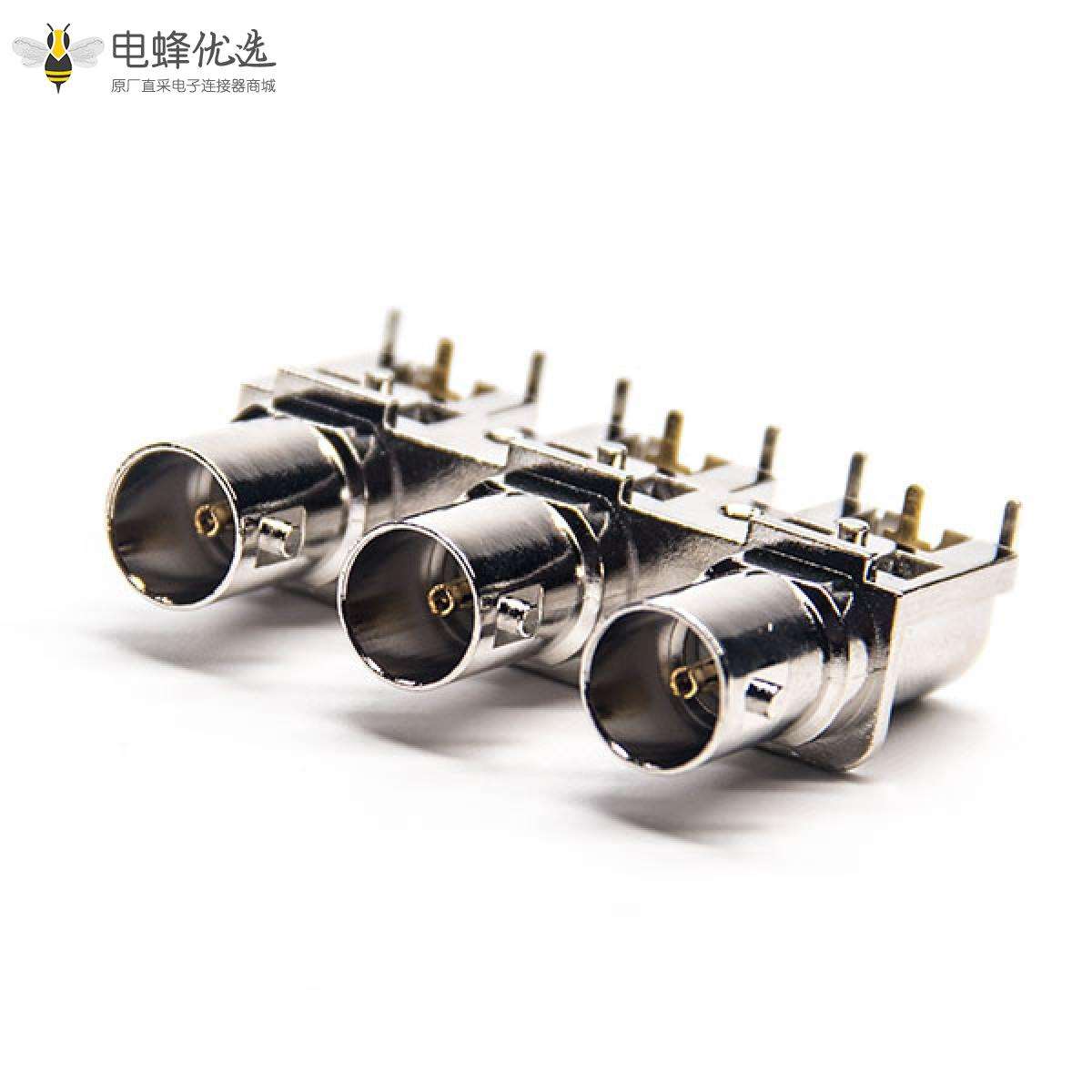 - BNC连接器,PCB板端,母头,弯式,锌合金,RF射频同轴,50欧姆,插孔,锌合金,镀镍,75欧姆;
