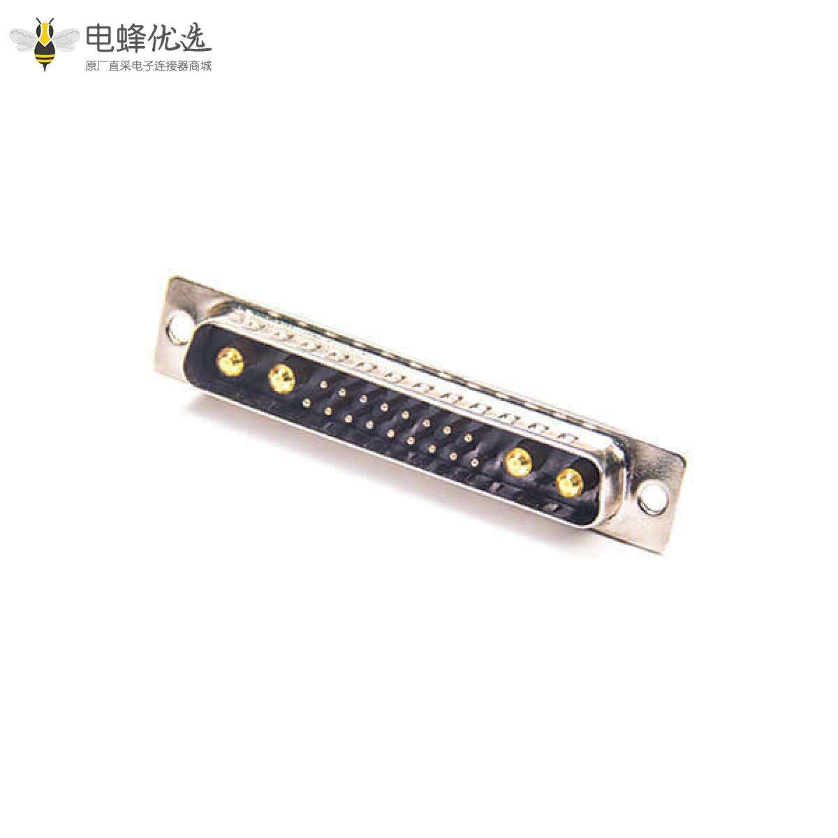 - 混合型D-sub连接器,插头,21W4,2排,单端口,直角型,机加工针,镀金,焊杯,电缆,无螺纹,IP20,无过滤;