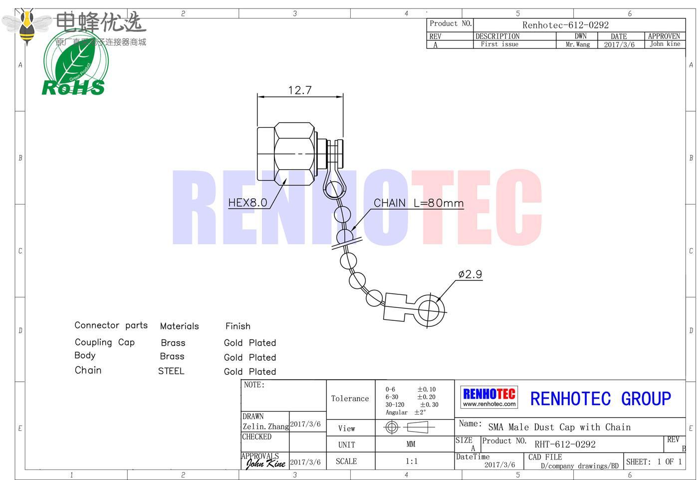 接RG142,RG405线缆时为170 V rms - 中心接触电阻:≦ 6.0mΩ (Milliohms max.)