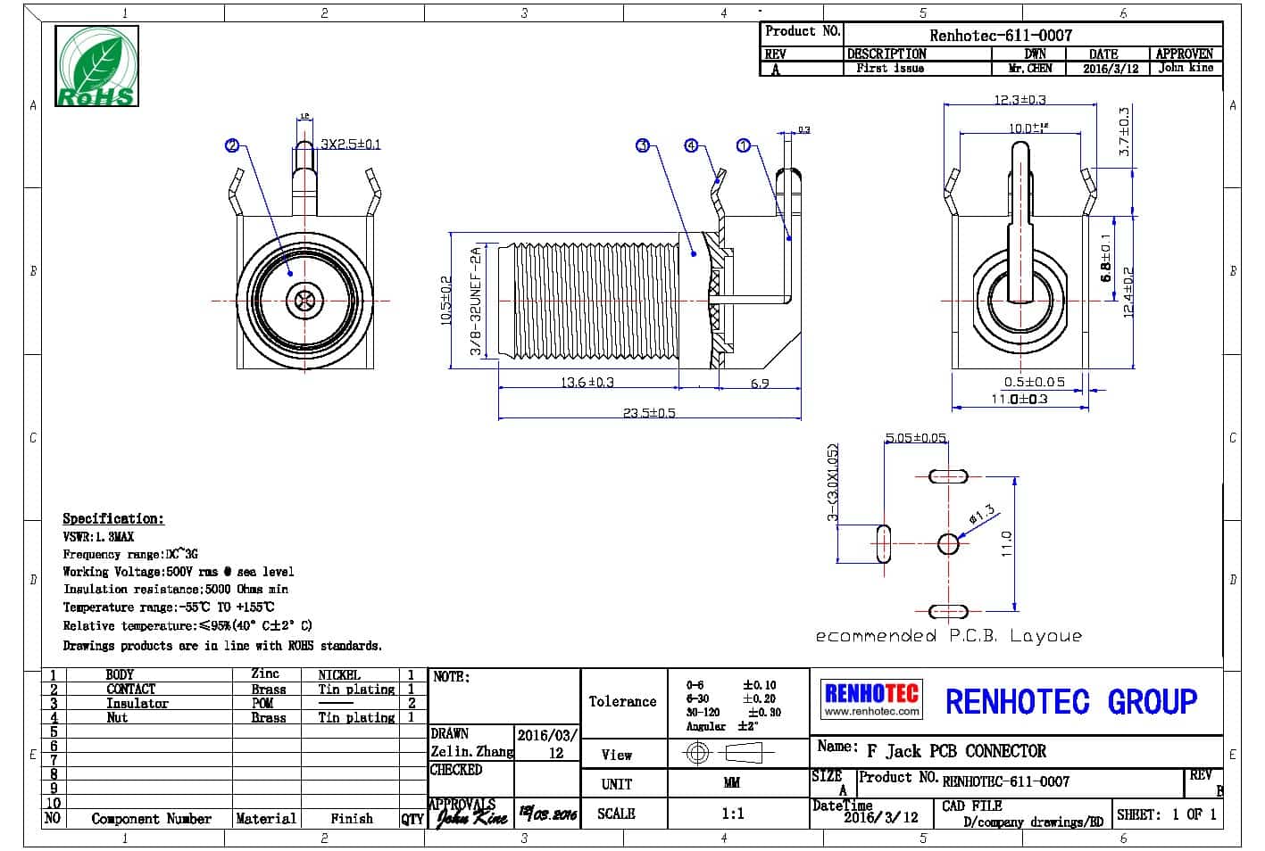 | CENTER CONTACT | Brass | Tin plating | |