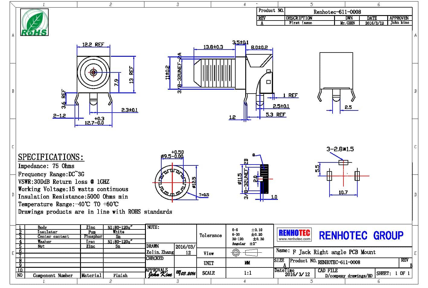 - 中心接触电阻: ≦ 10 mΩ (Milliohms max.)