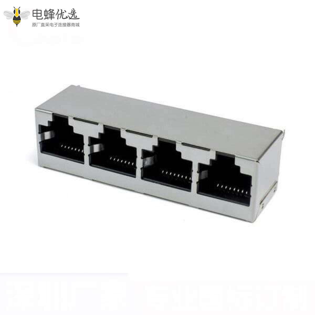 - RJ45连接器,插座,8P8C,单口,1*1,单层,弯式90°,镀金,插孔,PCB板安装,屏蔽,不带灯,不带滤波器,不带POE,不防水;