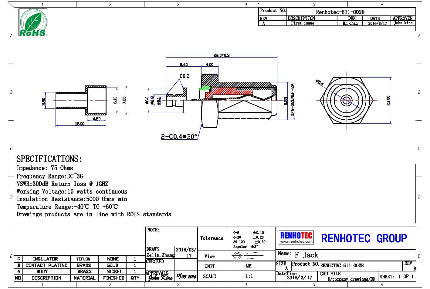 - 阻抗:75 ohm