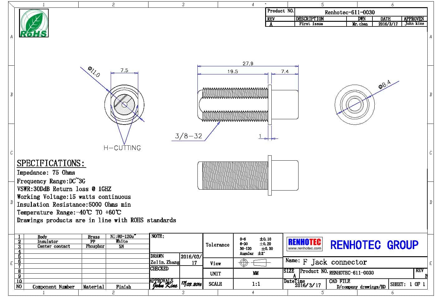- 阻抗:75 ohm