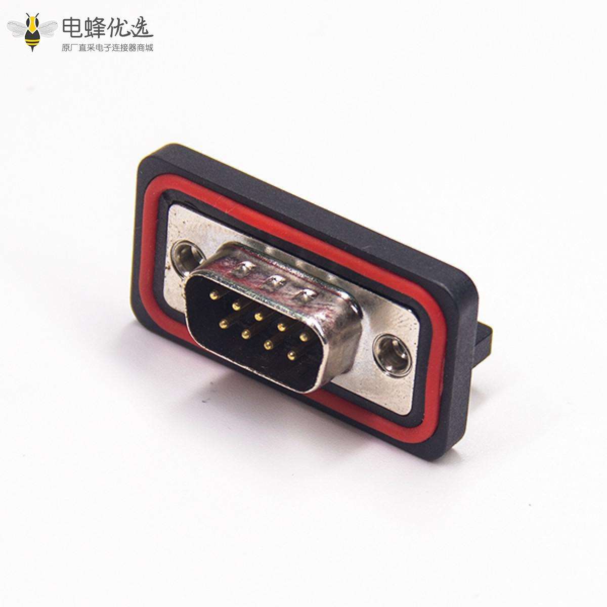 - 防水D-sub,插头,9针,2排,单端口,直角型,车针,镀金,垂直PCB安装,后铆螺母,IP67,不带滤波;