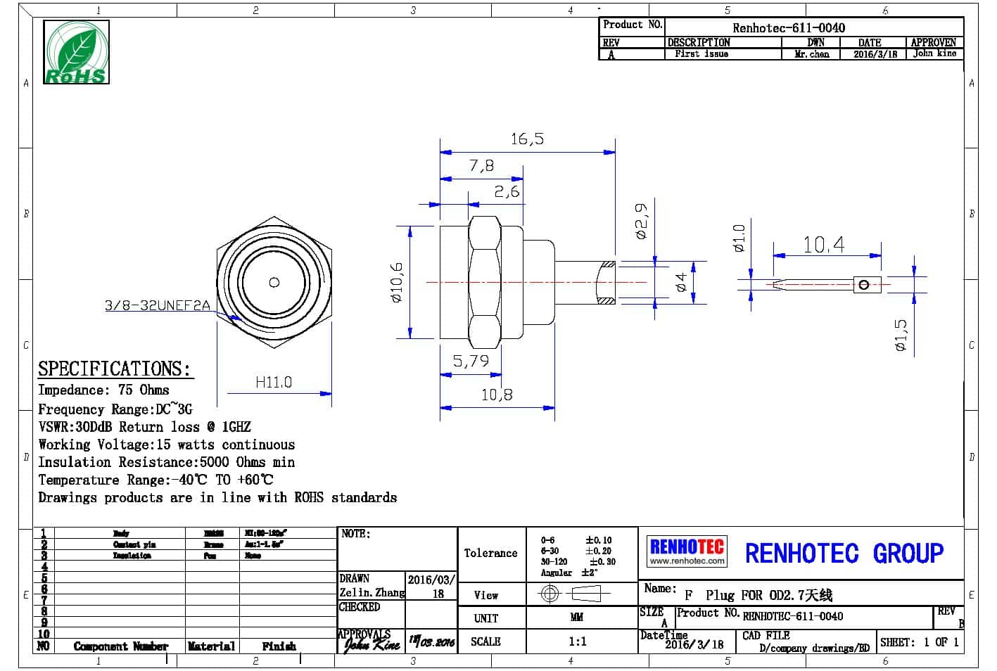 - 阻抗:75 ohm