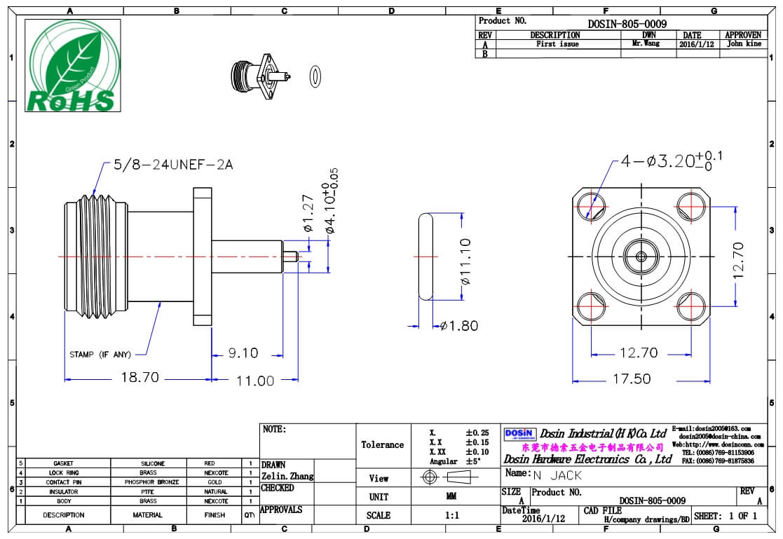 - 中心接触电阻: ≦ 1.0 mΩ (Milliohms max.)