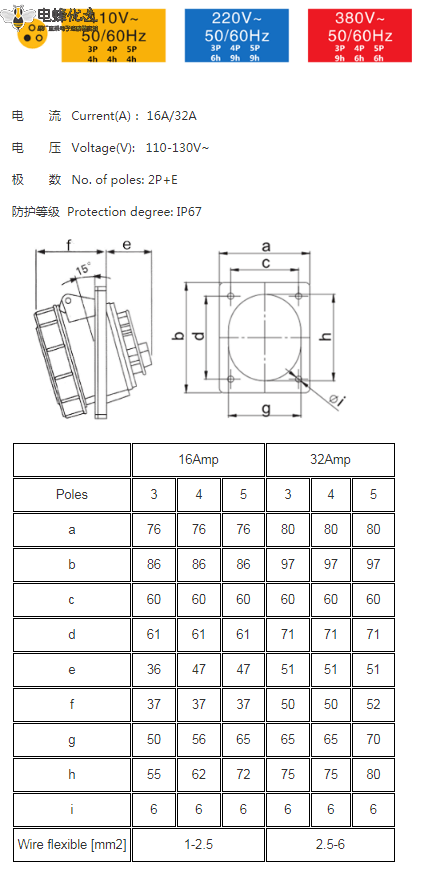 5芯,32A,380V-415V,暗装斜座,IP67,红色;