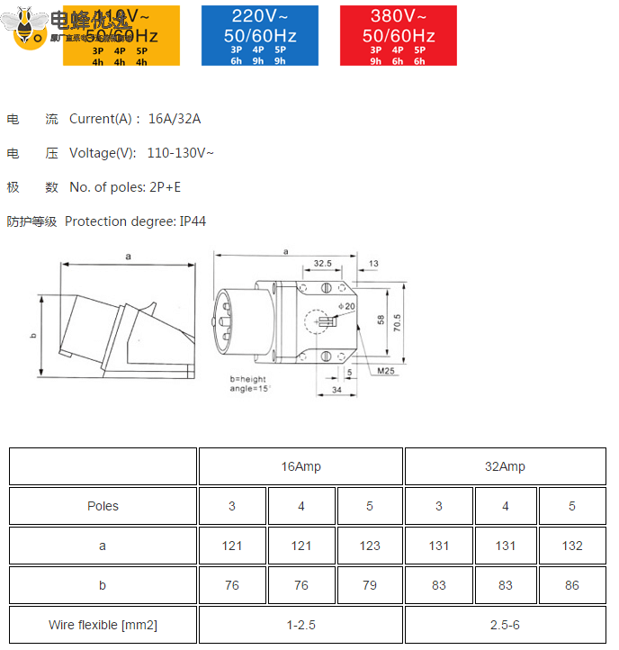 4芯,32A,380V-415V,明装器具插座,IP44,红色;
