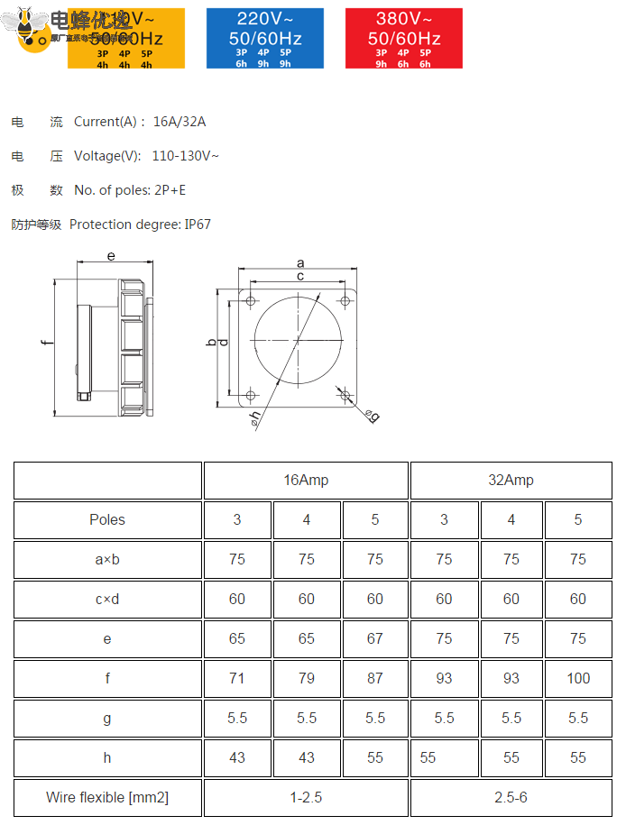 4芯,32A,380V-415V,暗装公插座,IP67,红色;