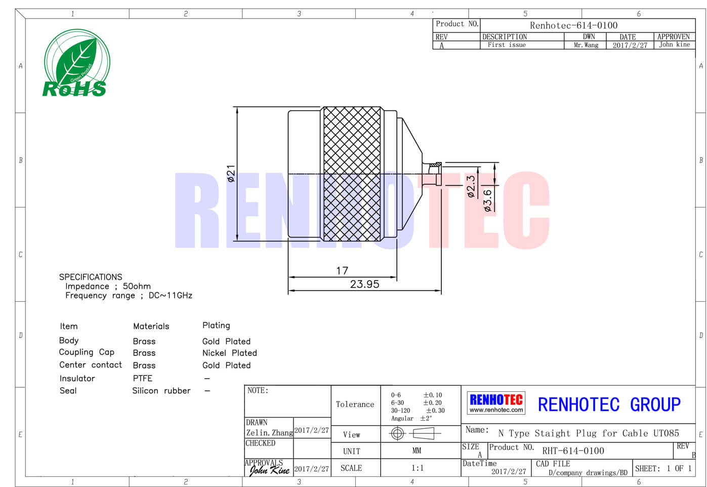 - 高性能连接器,频率范围达0到11GHz,阻抗50欧姆;