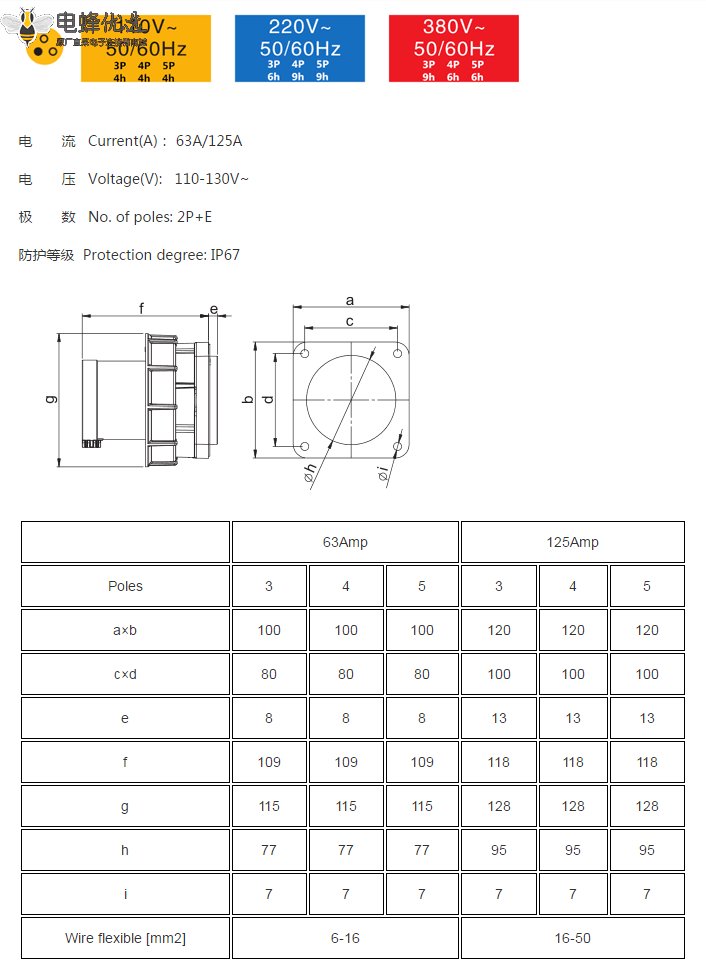 5芯,125A,380V-415V,暗装公插座,IP67,红色;