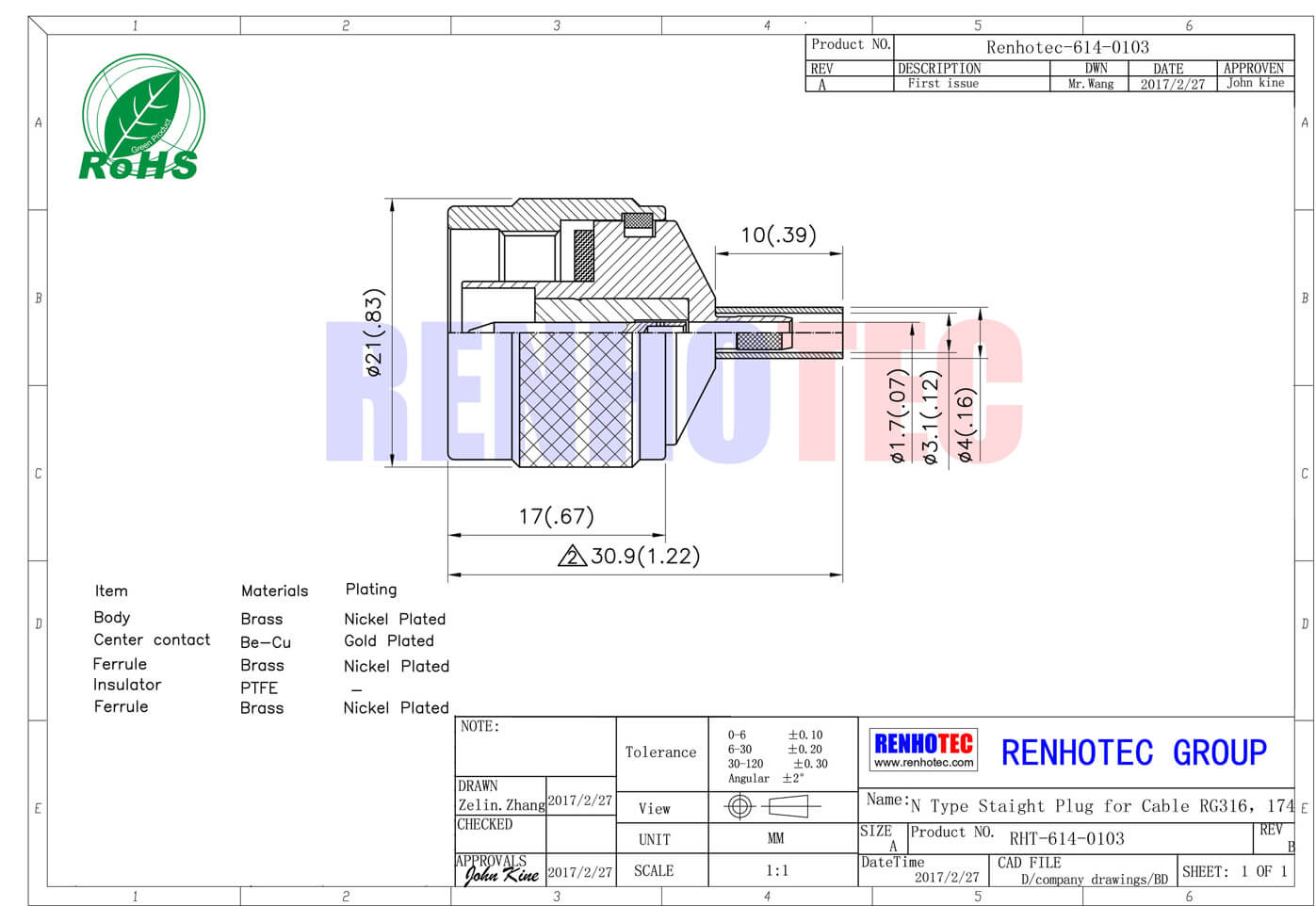 - n连接器,同轴线缆,公头,50欧,直式, 压接,RG316, RG174;