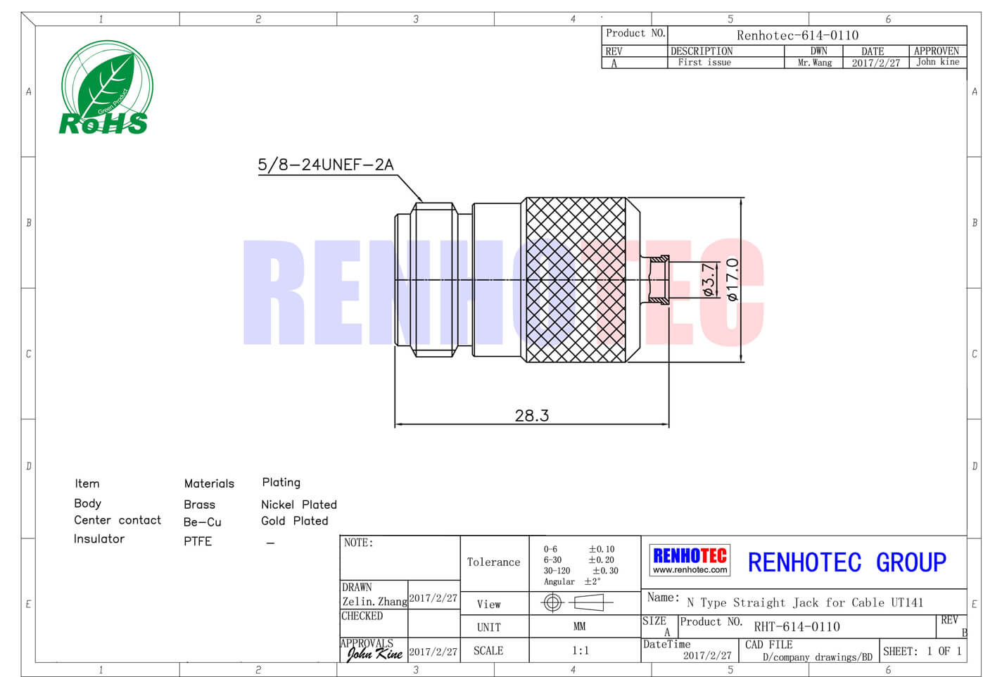 - 高性能连接器,频率范围达0到11GHz,阻抗50欧姆;