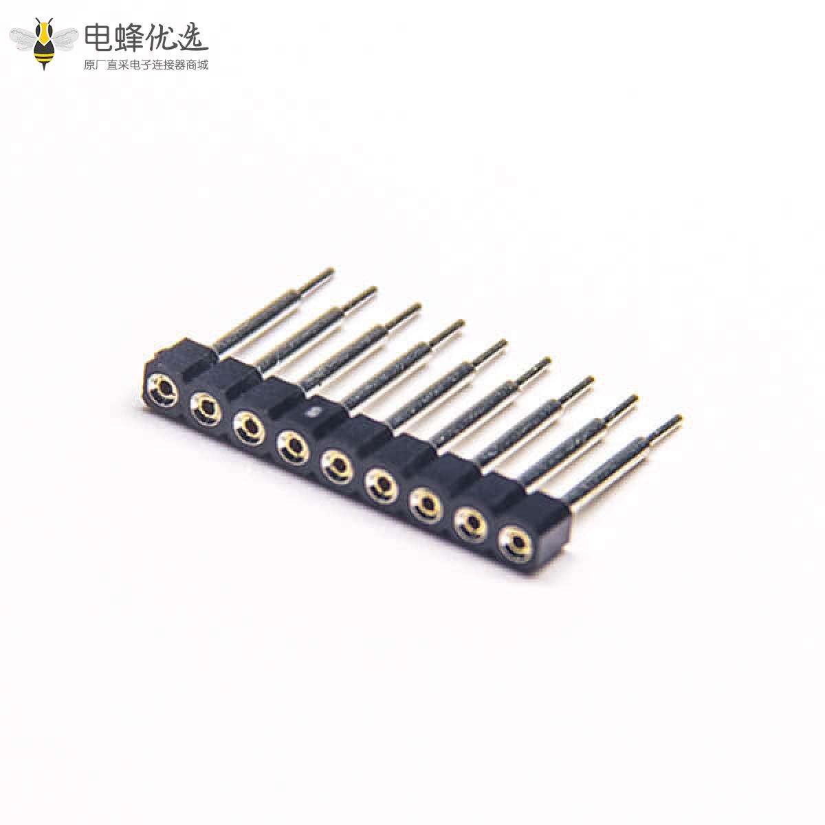 - 排母连接器,母头,直式,180度,9Pin,2.54mm,单排,圆孔,针长15.0mm,插板,焊接,镀锡,黑色,H3.0mm,圆针;