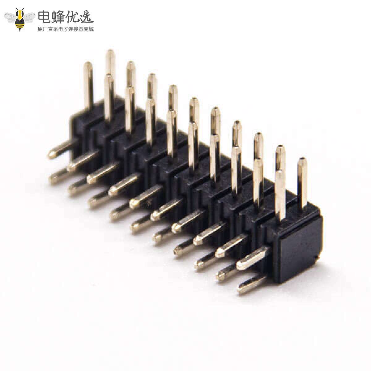 - 排针连接器,公头,弯式,90度,20Pin,2.0mm,双排,穿孔,焊接,镀金,黑色,H4.0mm,方形;