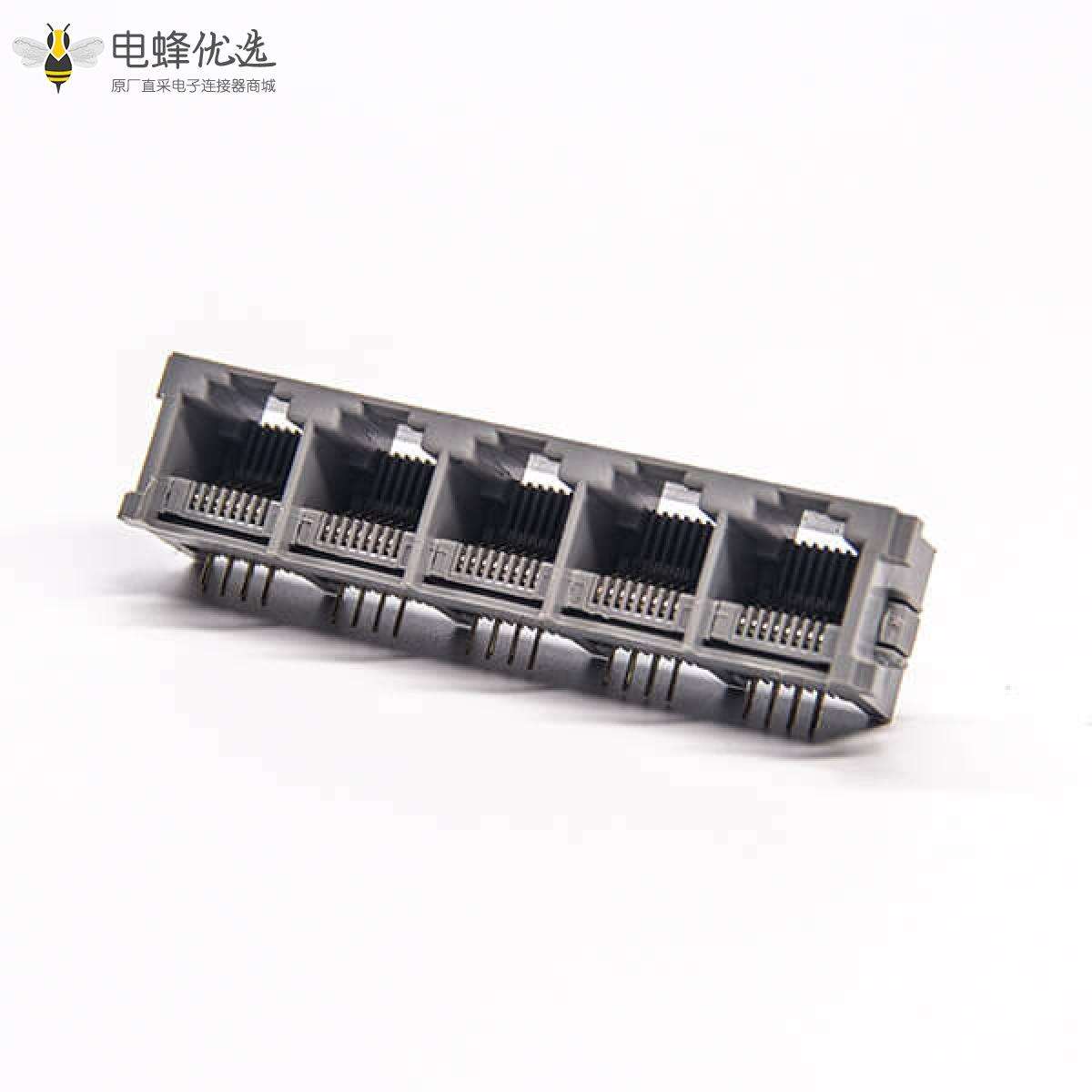 - RJ45插座,8P8C,5端口,1*5,弯式90°,触头镀金,插孔,PCB板安装,不带屏蔽,不带灯,不带滤波;