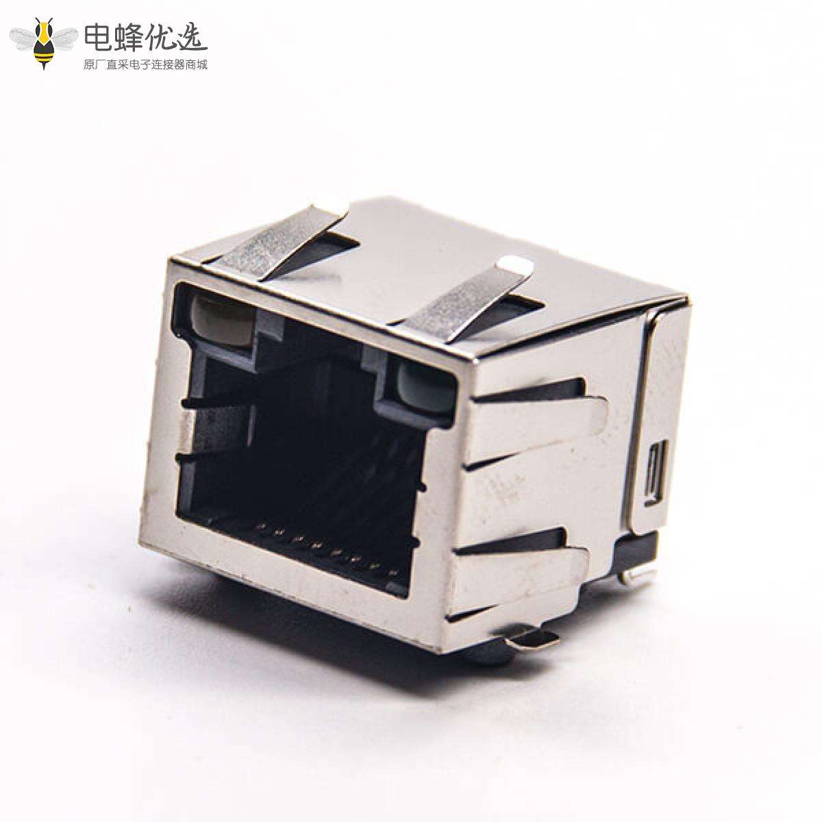RJ45插座,8P8C,单端口,1*1,直式180°,触头镀金,贴板,PCB板安装,带屏蔽,不带灯,不带滤波,带弹片;