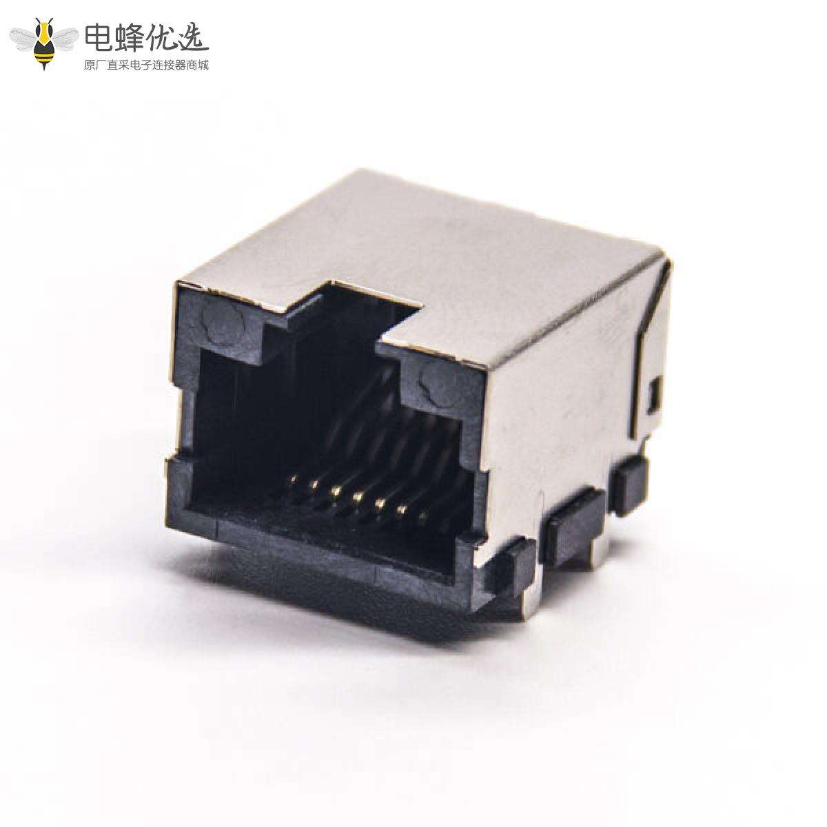 RJ45插座,8P8C,单端口,1*1,弯式90°,触头镀金,贴板,PCB板安装,带屏蔽,带灯,不带滤波;