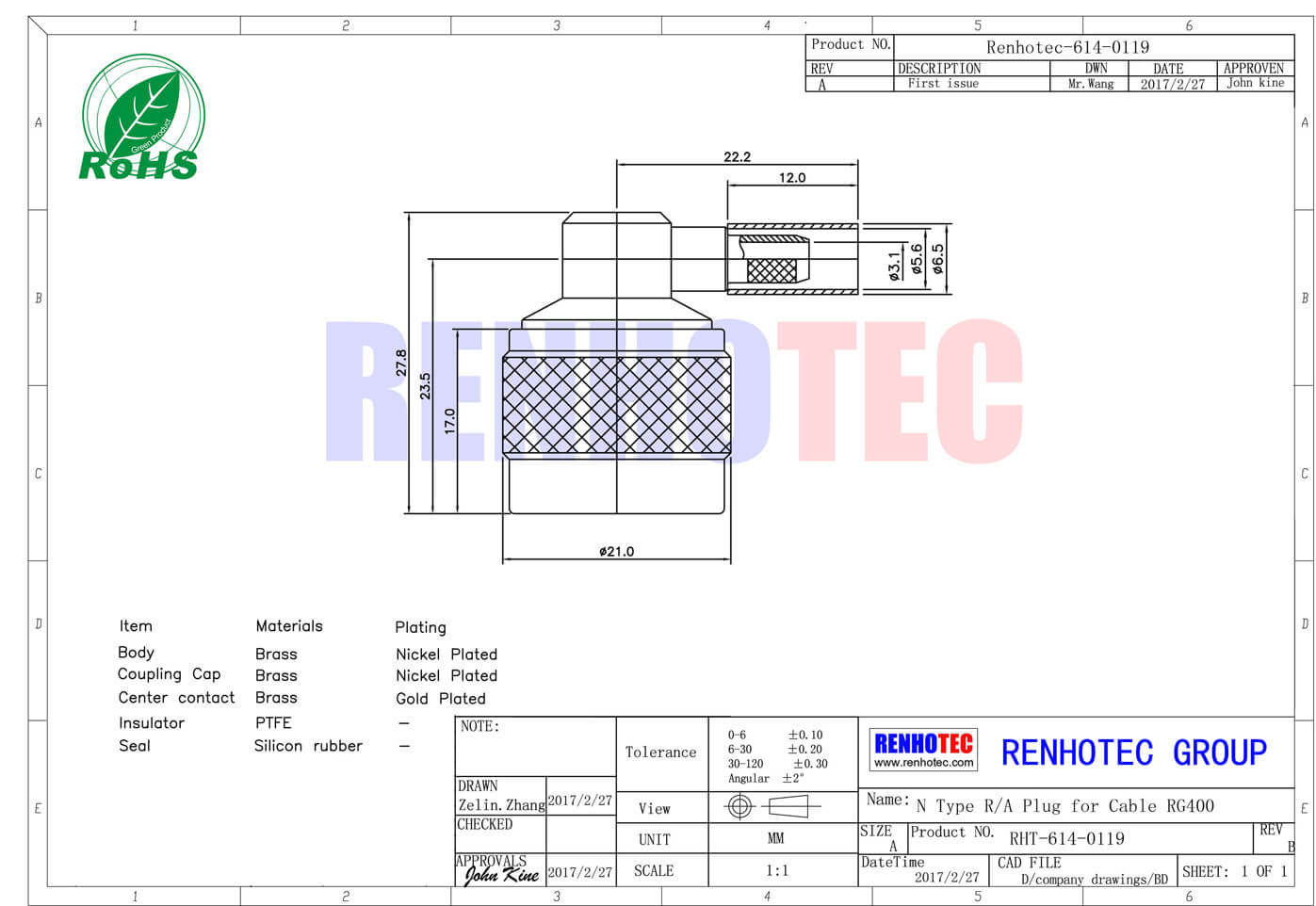 - n连接器,同轴线缆,公头,50欧,弯式,压接,RG400;