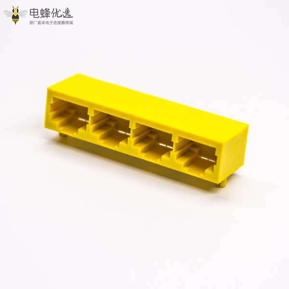 RJ45插座,8P8C,4端口,1*4,弯式90°,触头镀金,插孔,PCB板安装,非屏蔽,不带灯,不带滤波;
