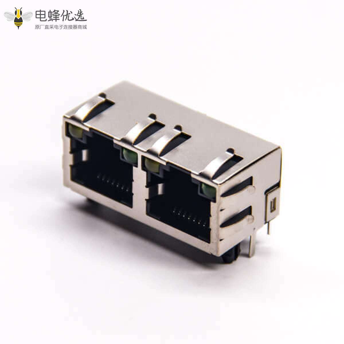 RJ45插座,8P8C,双端口,1*2,弯式90°,触头镀金,插孔,PCB板安装,带屏蔽,带灯,不带滤波;